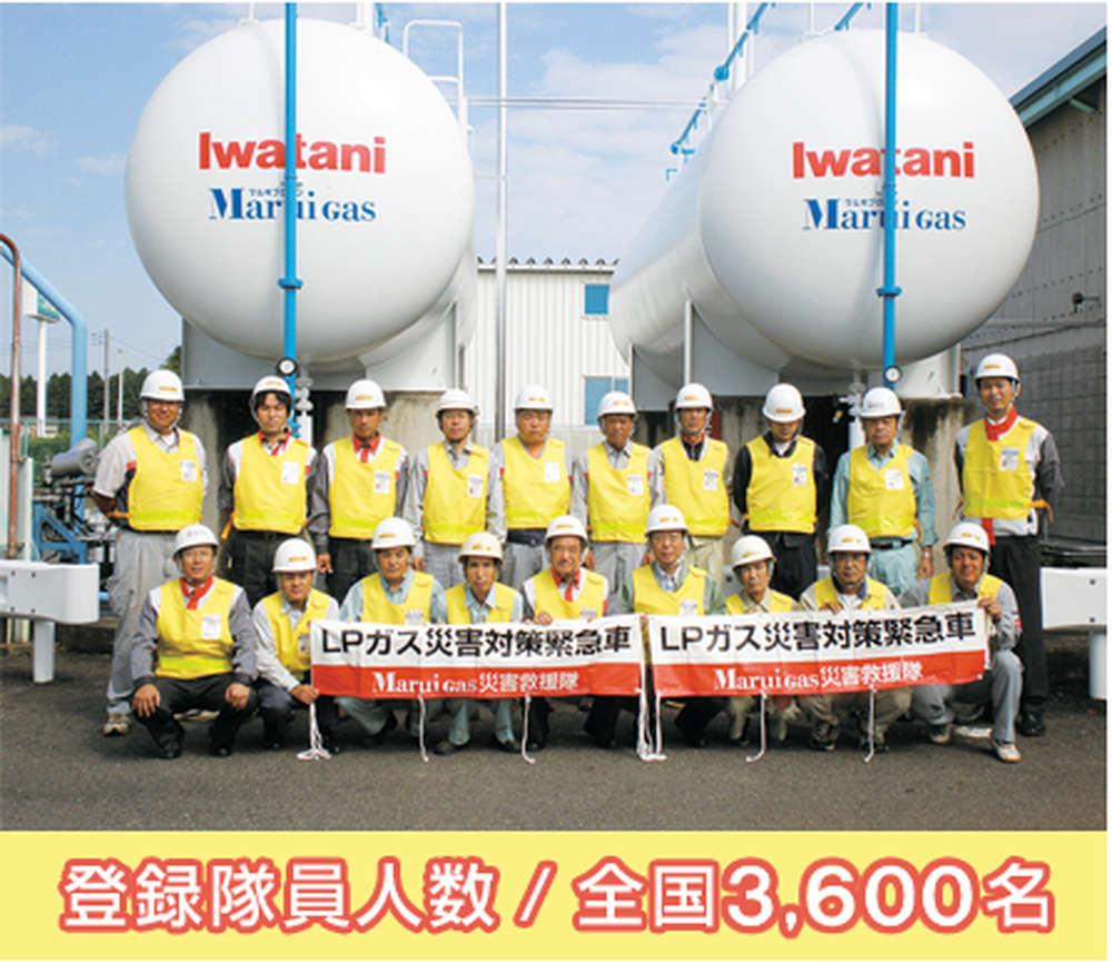 災害時にお客さまの安全を最優先に確保するため発足した「MaruiGas災害救援隊」は、地震や豪雨などの大きな災害時にいち早く駆けつけ、ガス機器の点検や漏えい検査を行い、ガスを復旧させるMaruiGasグループ独自の災害支援の全国組織です。